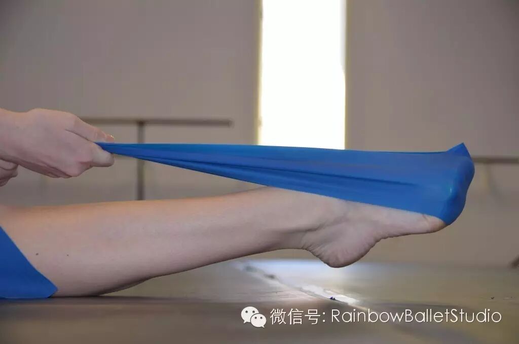 我们上课一再强调,外开是从大腿根部转开的,运用臀大肌的外旋和上图中的内侧肌达到外开的功能。芭蕾中的外开是科学的,只有在外开的前提下,才能最大限度地展现腿部的各种舞姿和技巧。要注意,千万千万不能用地面的摩擦力站出一个180度的外开,一来容易受伤,二来forced turnout无法完成芭蕾舞其他各种技巧的学习。使用theraband方法如下图所示,同学们依葫芦画个瓢试试看,一定可以感觉的内侧肌在用力了吧?体会到了之后要把这种内侧肌用力的感觉带到舞蹈课堂中哦。