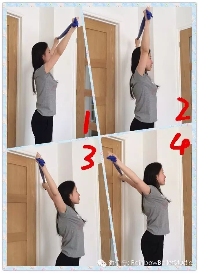 好吧,最后一个练习找不到合适的图片,Rainbow只有自己上了~按照下图的顺序,慢慢地让手臂从前到后画一个大圈圈。要注意的是,两手始终保持一个水平,不能一高一低;其次肩膀使劲往下,不要耸肩。肩关节的外开对一个漂亮的五位手,非常重要!