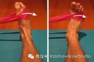 先来说说关于脚踝的练习,这里只说两个,其他还有很多,感兴趣的同学可以跟我讨论。第一个是turnout的练习,如下图所示,固定住theraband的一端,另一端套于脚掌,练习的时候用脚踝的力量turnout,也就是外开。