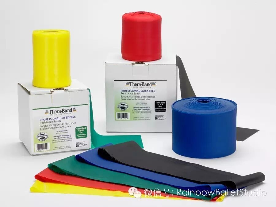 好啦,首先来说说什么是theraband,中文暂且称其弹力带吧,如果不正确,请大家指正。下面的图片就是它啦,theraband有非常多的颜色,每种颜色对应的强度不一样。以下图为例,黄色比较弱,黑色最为强。每个舞者根与自己的需要进行选择,当然不同的厂家颜色标识不一样,这点要尤为注意哦!