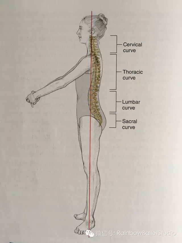 人体的脊椎有脊柱有4个弯曲,从侧面看呈S形,即颈椎前凸、胸椎后凸、腰椎前凸和骶椎后凸,这是正常人体的生理结构。Plumb line指的是从侧面观察,舞者的耳中线经过肩膀的中线, 股骨大粗隆中心线,膝盖外侧中线,一直到外侧踝的中线。 但是在长期不良站姿坐姿影响下,这四个生理弯曲均可能或多或少的加剧弯曲度。对于芭蕾初学者而言,最明显的两个错误是arched back和tuck under,如下图所示 (Haas 20)。