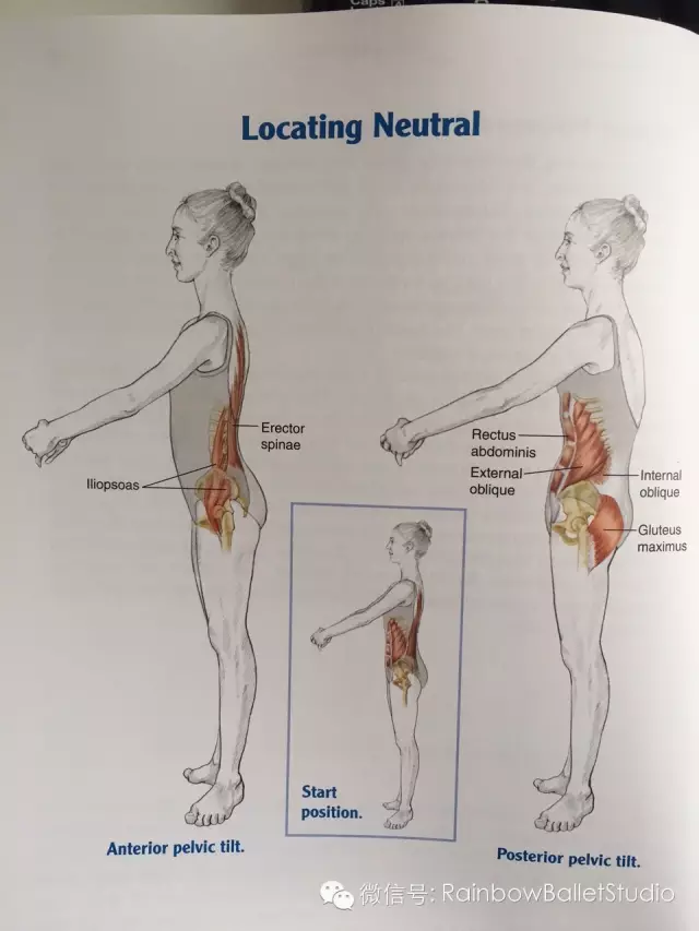 左边就是arched back,右边是tuck under,初学者可以自己向前向后调整自己的骨盆找到站得最高的位置就是你的neutral pelvis position。稳定的骨盆位置对于任何芭蕾动作都是至关重要的,比方说我们昨天做的classical walk,在比方说中间小跳,骨盆位置控制的比较好,空中“泥鳅扭”就少一些。每个人的骨骼结构有差异,所以重心,站姿又会稍稍有点差别,每个人都要找到自己的neutral pelvis position,找不到的同学下周上课来问我。