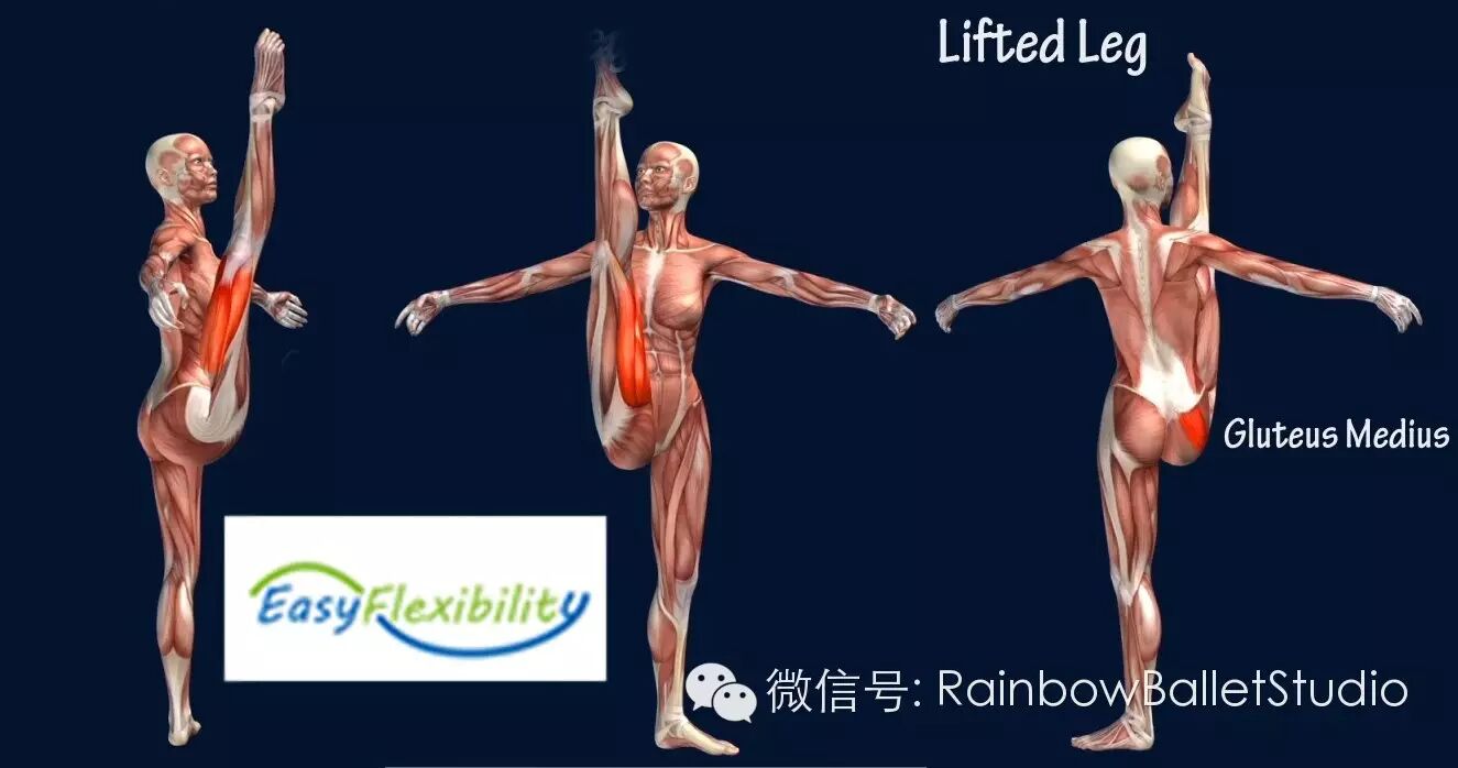 接着我们看看向前大踢腿的肌肉图,红色标出来的地方是被拉伸的肌肉,主要是三块,还有一些深层的小肌肉。热身不够容易受伤的也是这三块地方。所以Rainbow提醒大家一定要找专业的老师教舞蹈,不能自己乱模仿哦。